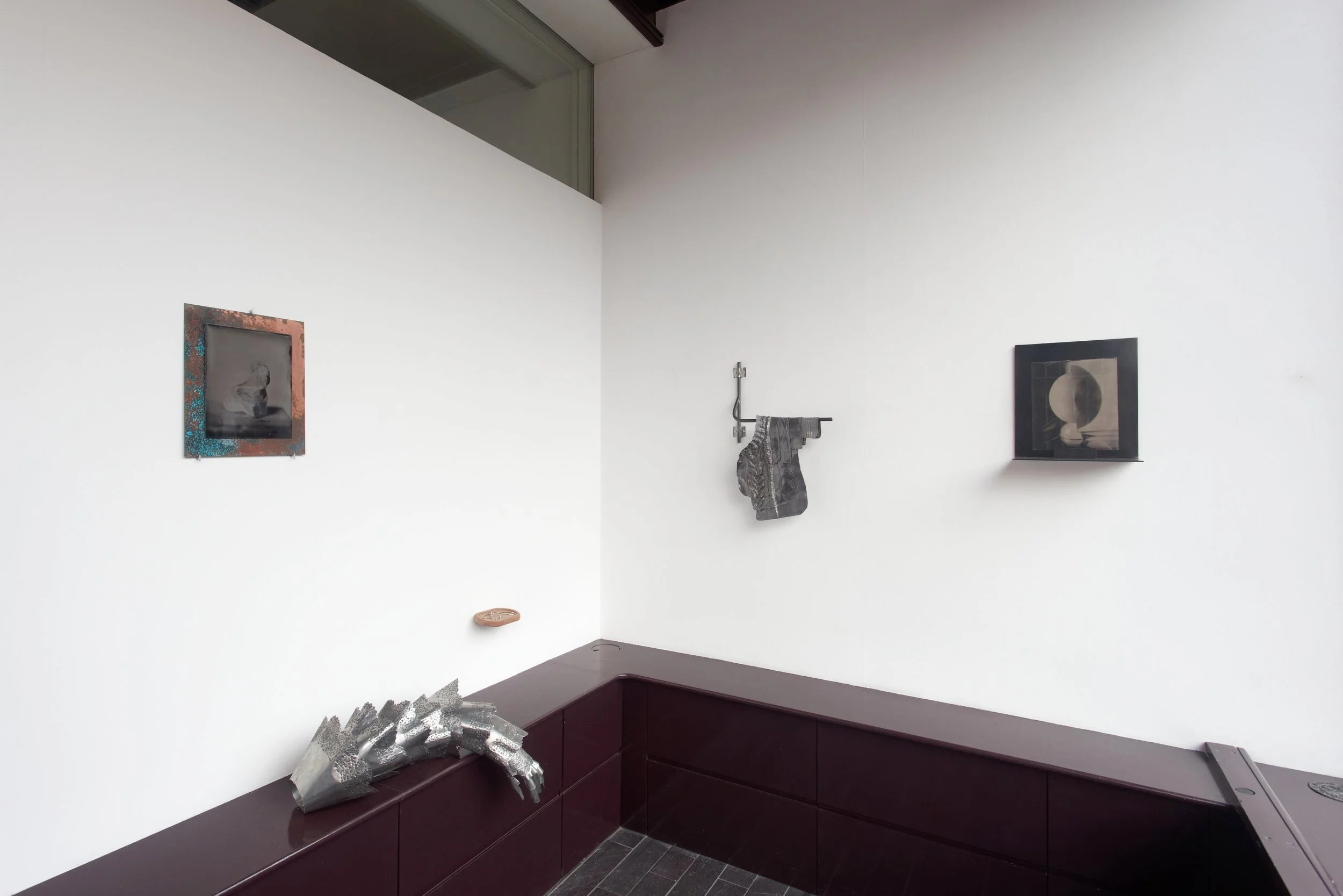 Kasia Wozniak’s practice considers transformation as both a physical and metaphysical process - how material shifts echo internal states of becoming. Her wet plate collodion photographs are selected from their series Objects in Space (2017) and Cosmic Egg (2025), alongside new work which embarks on a research series exploring the alchemy of symbols. Through layered surfaces and translucent forms, Wozniak examines cycles of protection and exposure, containment and release. Her works evoke a space of metamorphosis, where matter hovers between the organic and the elemental. The soft, transient imagery sits in direct contrast to the hard edged, metal supports they are presented on.